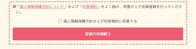 「個人情報保護方針について」「利用規約」のリンクをクリックして、個人情報保護方針に同意するにチェックを入れてください。次に登録内容確認ボタンをクリックしてください。